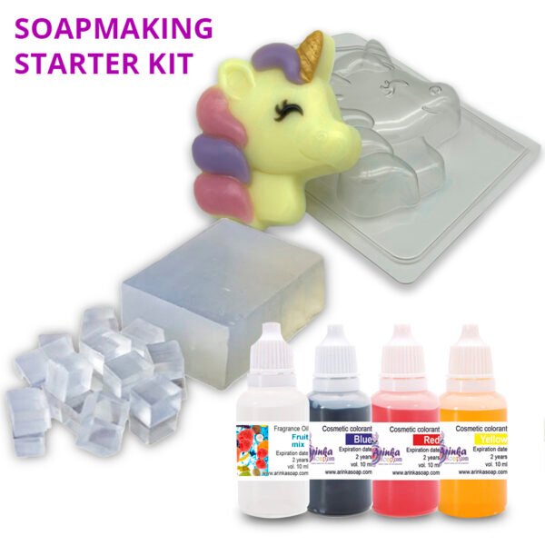 Beginners basispaket, bevat alle nodige materialen en een gebruiksaanwijzing om met gietzeep te leren werken. Inhoud: -500 gram gietzeep (transparant) -3×10 ml cosmetische kleurstof (geel, blauw, rood) -1×10 ml geurolie voor gietzeep (Patchouli) -1 plastic mal (Halloween)