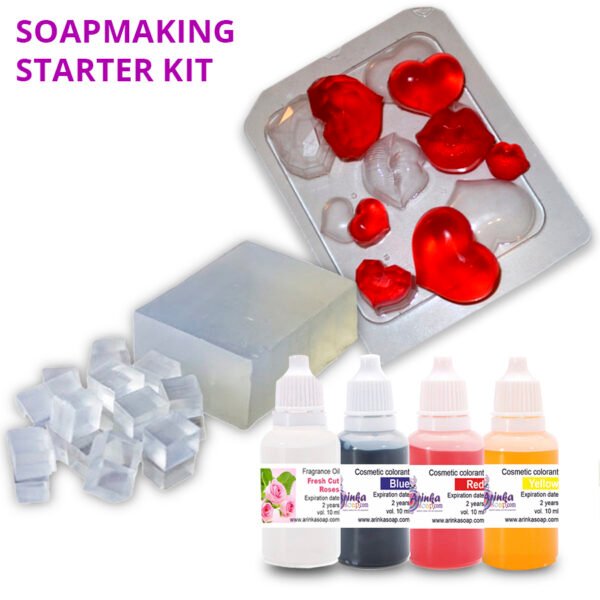 Beginners basispaket, bevat alle nodige materialen en een gebruiksaanwijzing om met gietzeep te leren werken. Inhoud: -500 gram gietzeep (transparant) -3×10 ml cosmetische kleurstof (geel, blauw, rood) -1×10 ml geurolie voor gietzeep (roos) -1 plastic mal (amour)