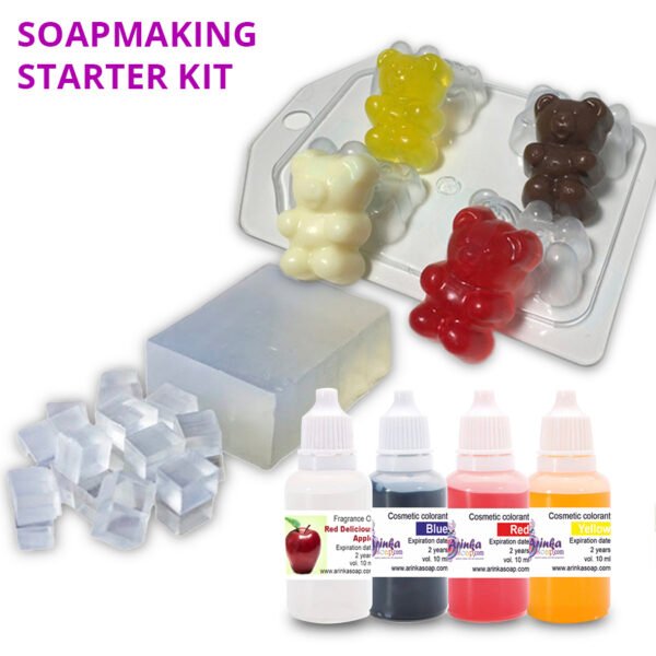 Beginners basispaket, bevat alle nodige materialen en een gebruiksaanwijzing om met gietzeep te leren werken. Inhoud: -500 gram gietzeep (transparant) -3×10 ml cosmetische kleurstof (geel, blauw, rood) -1×10 ml geurolie voor gietzeep (roos) -1 plastic mal (amour)